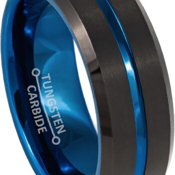 8mm Mens 2-Tone Blue Tungsten Wedding Band, Black Brushed Finish with Grooved Center, Comfort-Fit Beveled Edge Engagement Ring